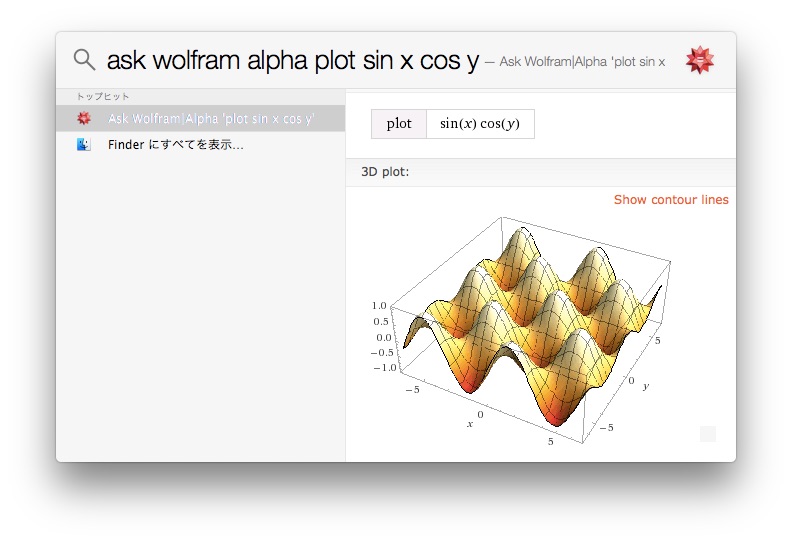 YosemiteのSpotlightは検索機能が使えますが、Bing以外の検索サイトは使用できません。しかしFlashlightの”Search more websites”や”Wolfram Alpha Search”プラグインを使用すればGoogleやWolfram Alphaで検索が可能です。
