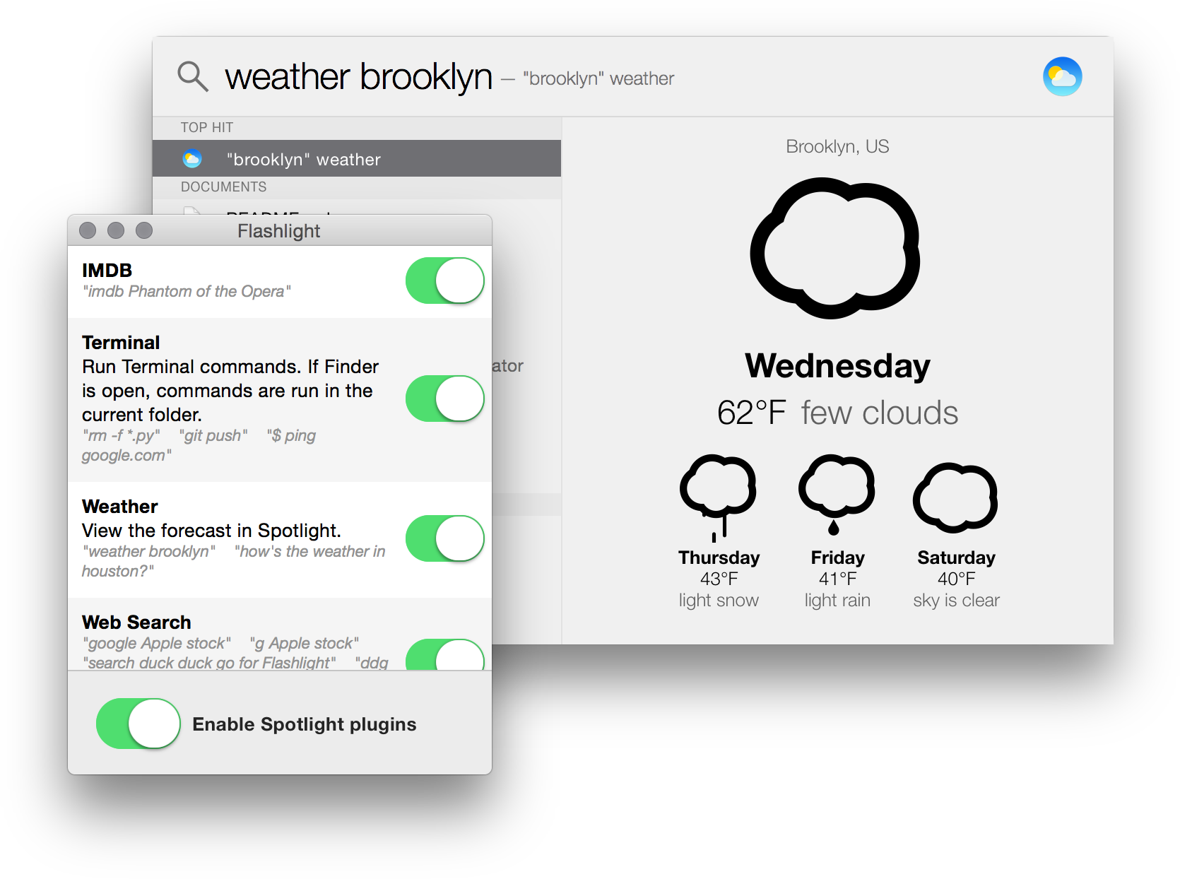 Flashlight is an unofficial Spotlight API that allows you to programmatically process queries and add additional results. It’s very rough right now, and a horrendous hack, but a fun proof of concept.