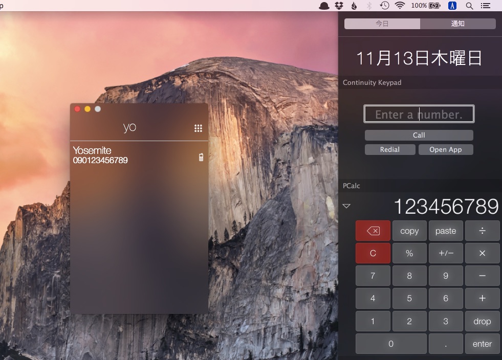 また、連絡先.appに登録されている名前から電話番号を選択でき、Yosemiteの通知センターWidgetsにも対応しています。