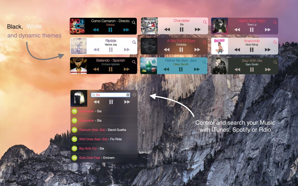 MiniPlayer for MacはiTunes, Spotify, Radioのコントロールが出来、iTunesライブラリ内の検索も可能です。テーマはホワイトとブラック、更に曲のアートワークによって色が変わるダイナミックテーマ(Switch Theme)が用意されています。
