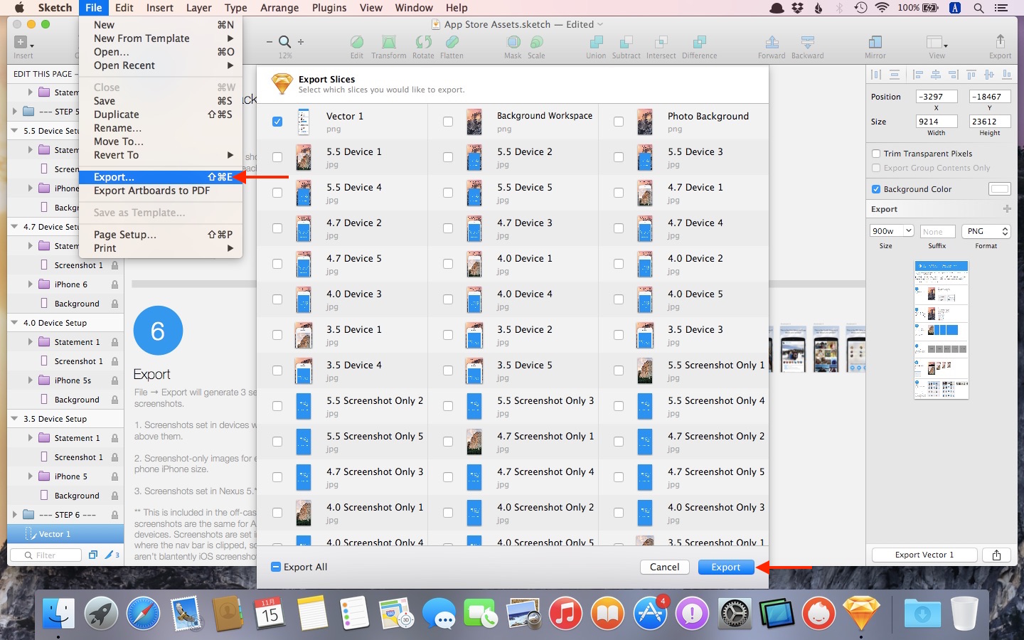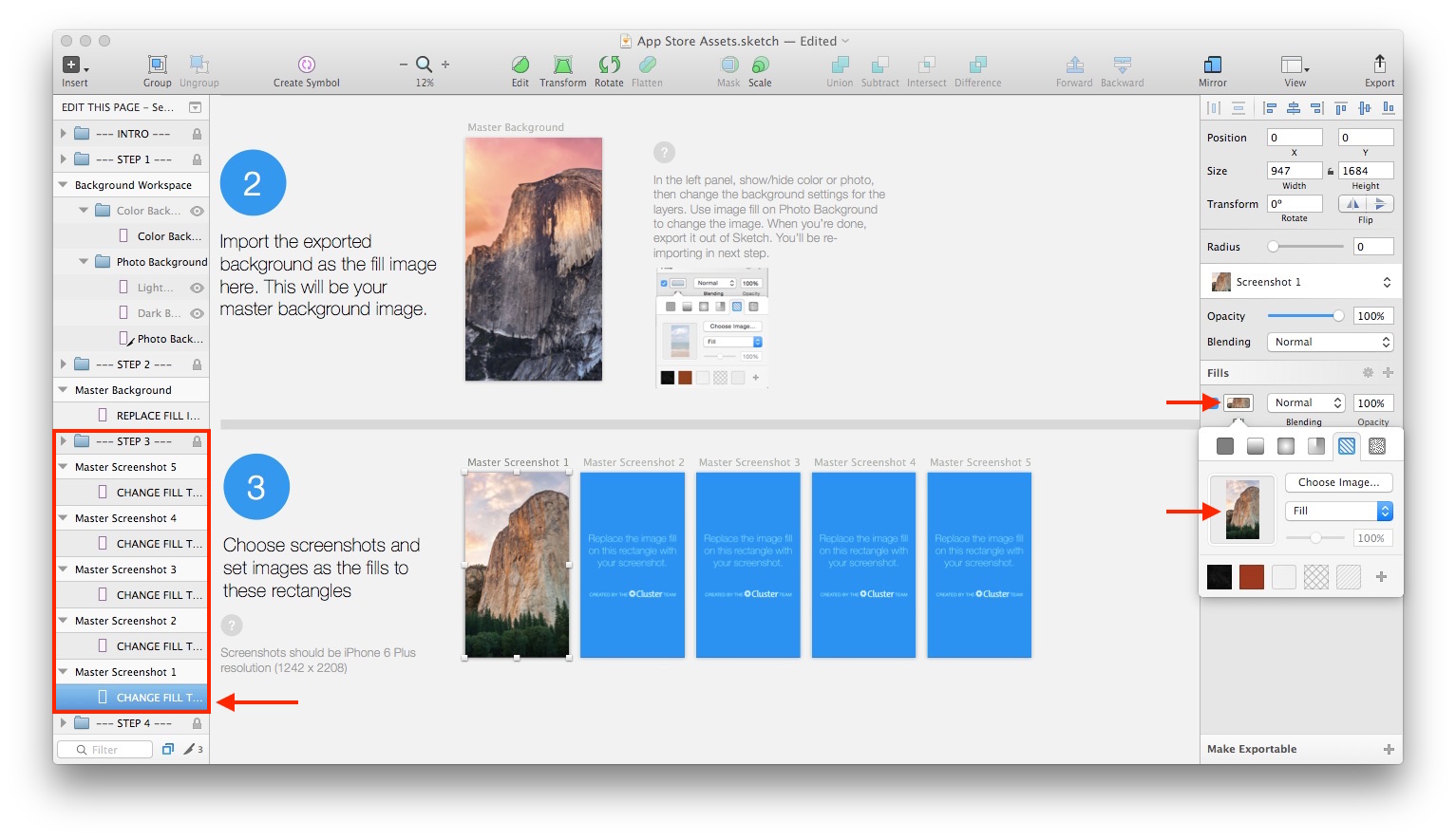 3.まず、壁紙を「Sketch to App Store」用にトリミングします。Step 1の左パネルの”Photo Background”を選択し、次に右パネルの”Fills”から”Choose Image”を選択して使用したい壁紙を設定。このバックグラウンドを右パネル下の”Export”から書き出しておきます。