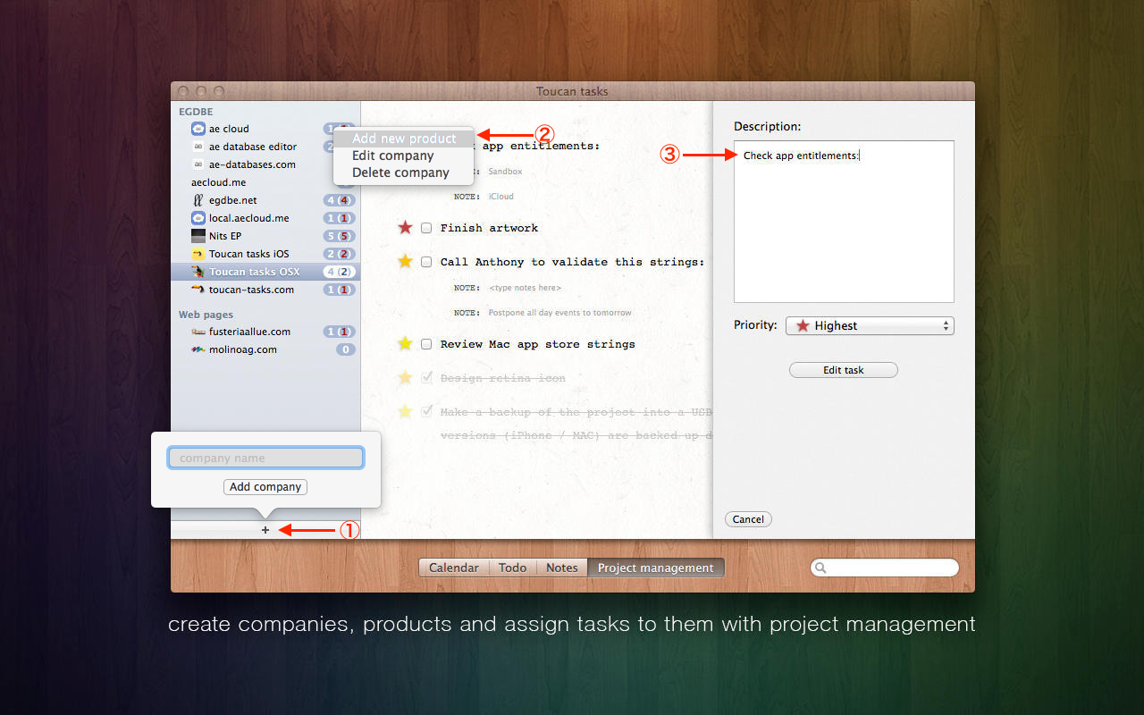 「Project management」については”Add company”で会社名を追加し、コンテキストメニューから”product”を追加、更に右上の[+]ボタンから”task”を追加していく形です。