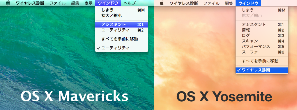 OS X Yosemiteでは「ワイヤレス診断.app」のユーティリティツールが全て別ウィンドウで開き全ての情報を一度に見れるようになっています。詳細は以下から。