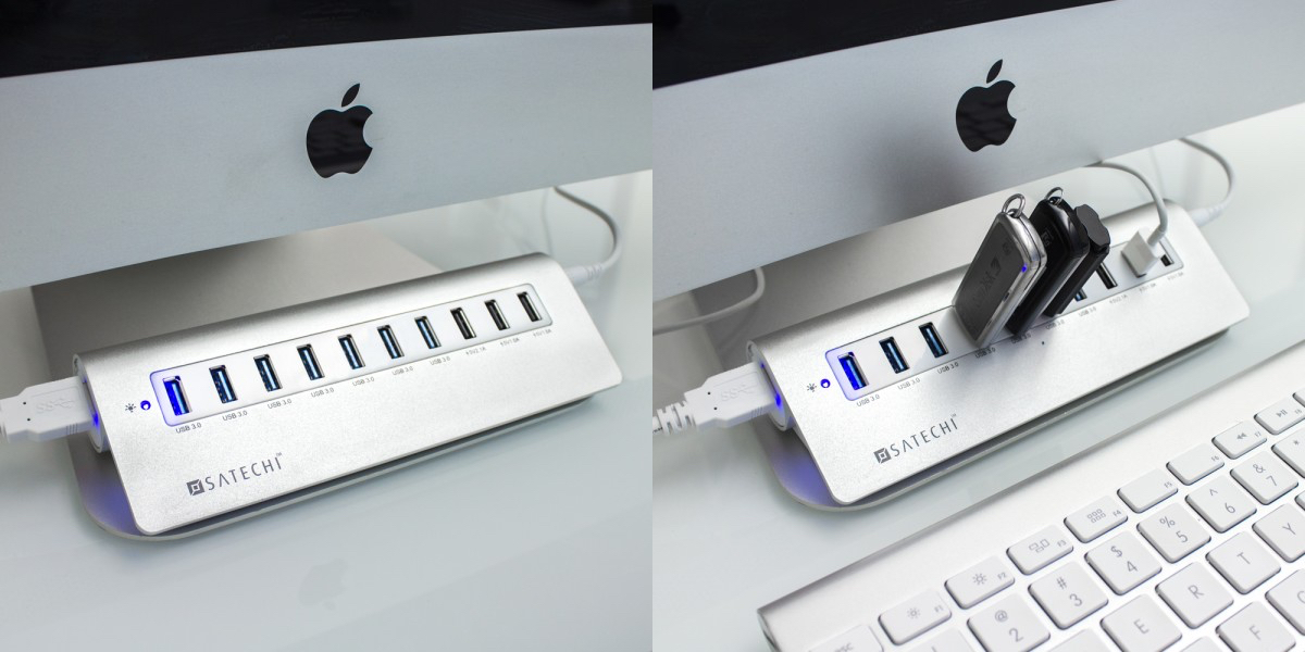 The Satechi 10-Port Premium Aluminum USB 3.0 Hub adds 7 more USB ports to your computer to connect 7 USB devices for accessing, as well as three charging ports to provide power to your smartphones, tablets, and other mobile devices.