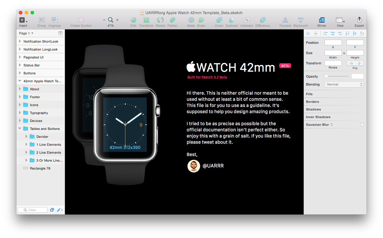 Apple Watch GUI Sketch Templateの作成には現在Beta版のSketch 3.2が使用されているので、現在Mac App Storeで配布されているSketch 3.1では開くことが出来ませんが、Beta版は誰でもダウンロードできるようになっています。