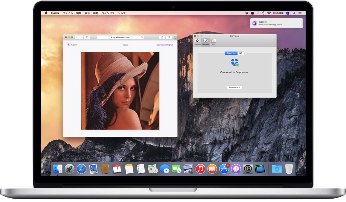 Kibakoの使い方は公式サイトからアプリをダウンロードし、起動。DropboxかAmazon S3アカウントで認証するだけでショートカットキー(Default:Command + Shift + ] )を使ってファイルをアップロードできます。