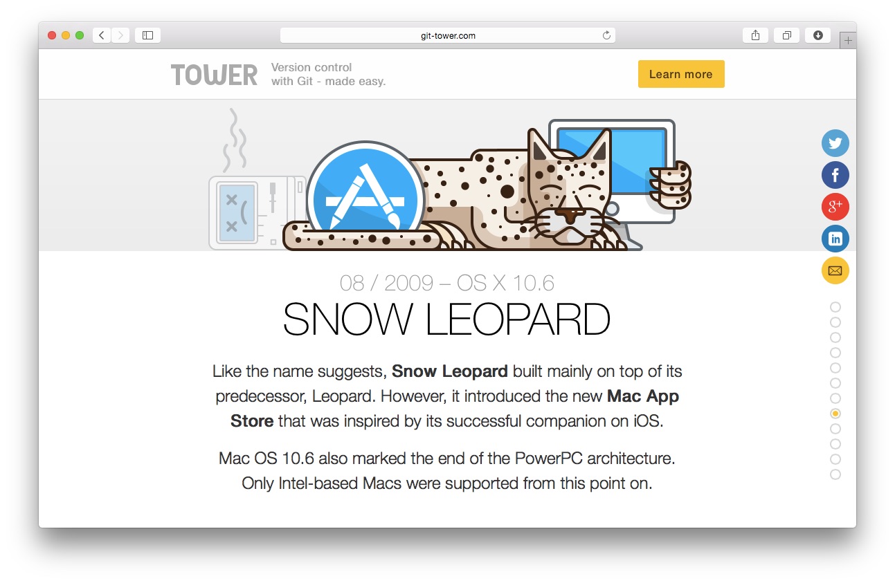 OS X用のGitクライアント「Tower」を開発・販売しているドイツのfournova Software GmbHがTower BlogでMac OS X 10.0からOS X 10.10の歴史をイラストで振り返れる「An Illustrated History of Mac OS X」を公開しています。詳細は以下から。