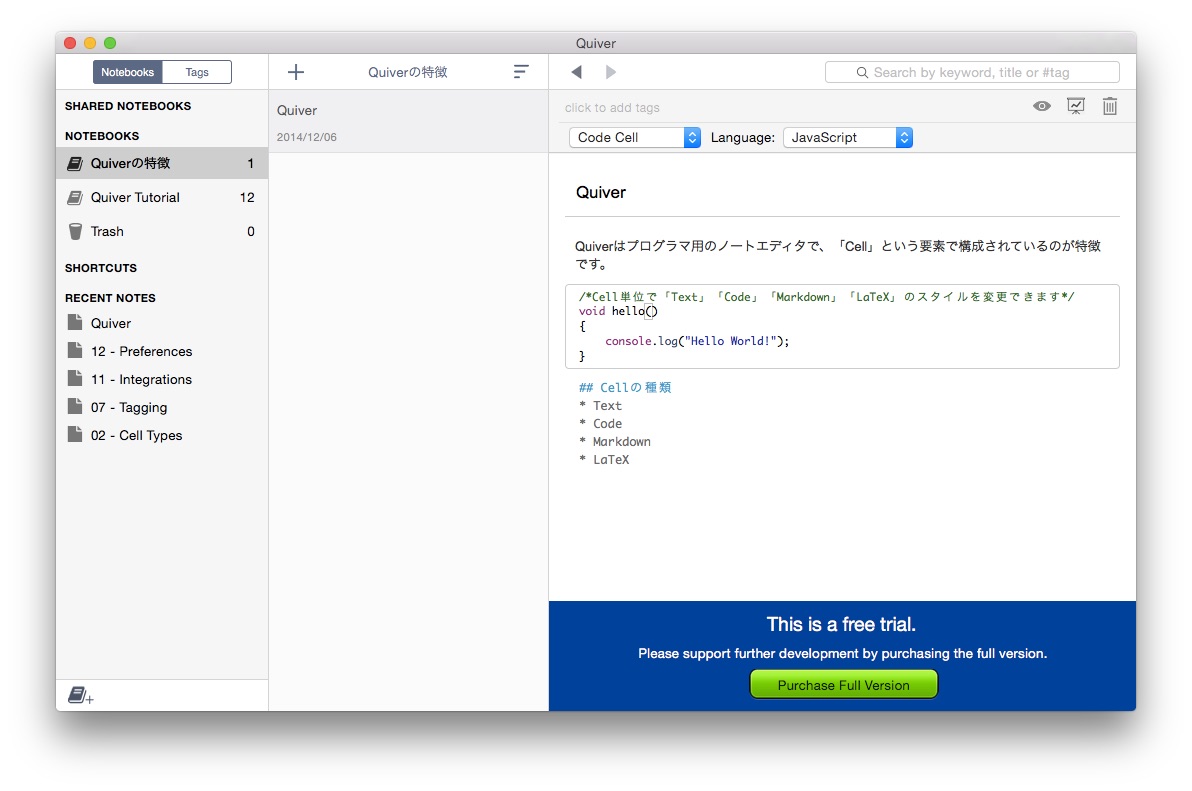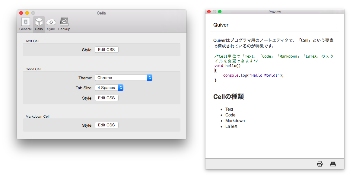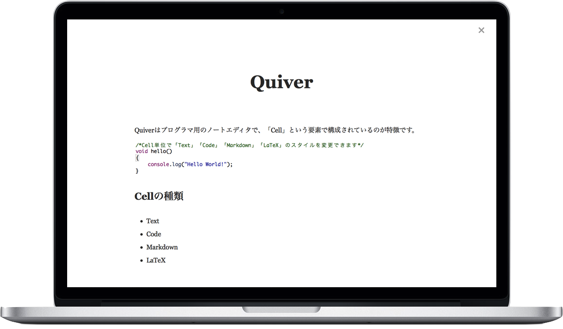 Quiverは1つのノートが複数の「Cell」という要素で構成され、Cell別にText、Code(Highlight)、Markdown、LaTeX記法とスタイルが使用可能なプログラマ向きノートアプリです。