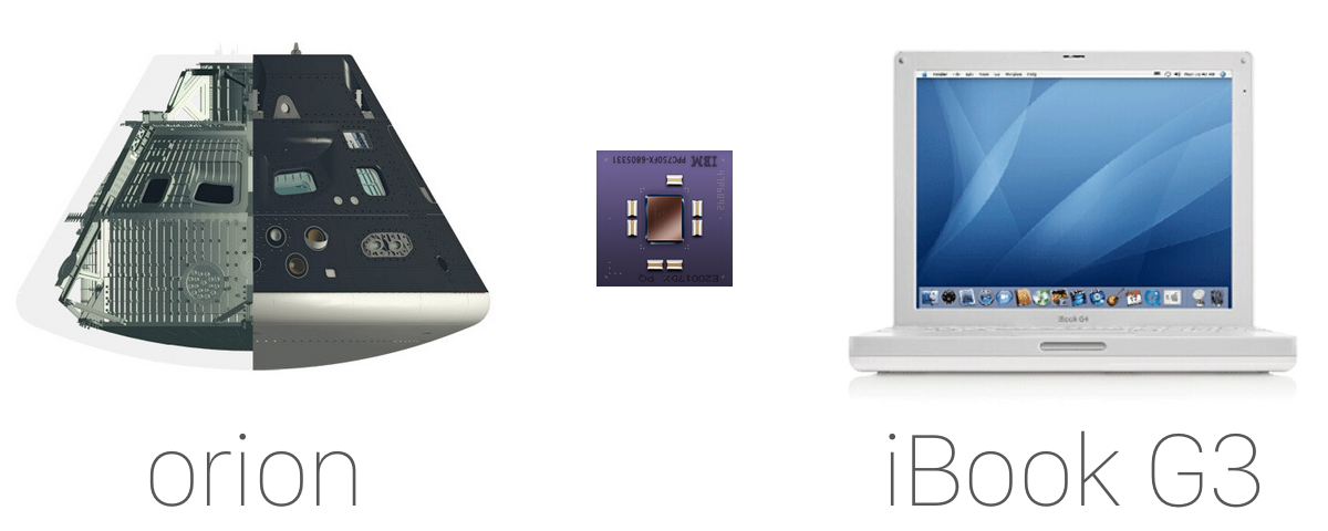 PowerPC chips haven’t been of any importance in consumer applications since Apple moved to the x86 architecture starting in 2005. Before that, PowerPC was at the heart of all Apple’s machines. In fact, some versions of the iBook G3 from 2003 ran the exact same chip being used in the Orion flight computer.