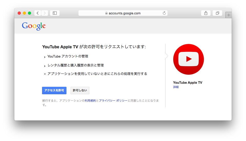 YouTube Apple TVが次の許可をリクエストしています。