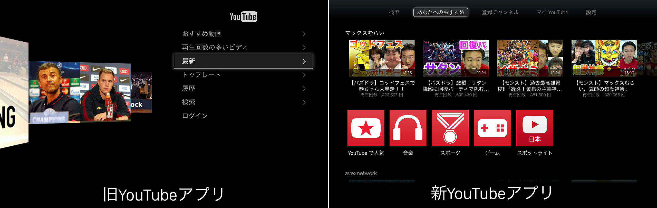 トップメニューにはCoverFlow風のサムネイルが消え、Xboxやその他のデバイスと同様サムネイルが横並びになり、YouTubeアカウントでログインしなくてもローカル情報から各国で人気の動画(日本だとマックスむらいさんやヒカキンさん等)が表示されるようになっています。