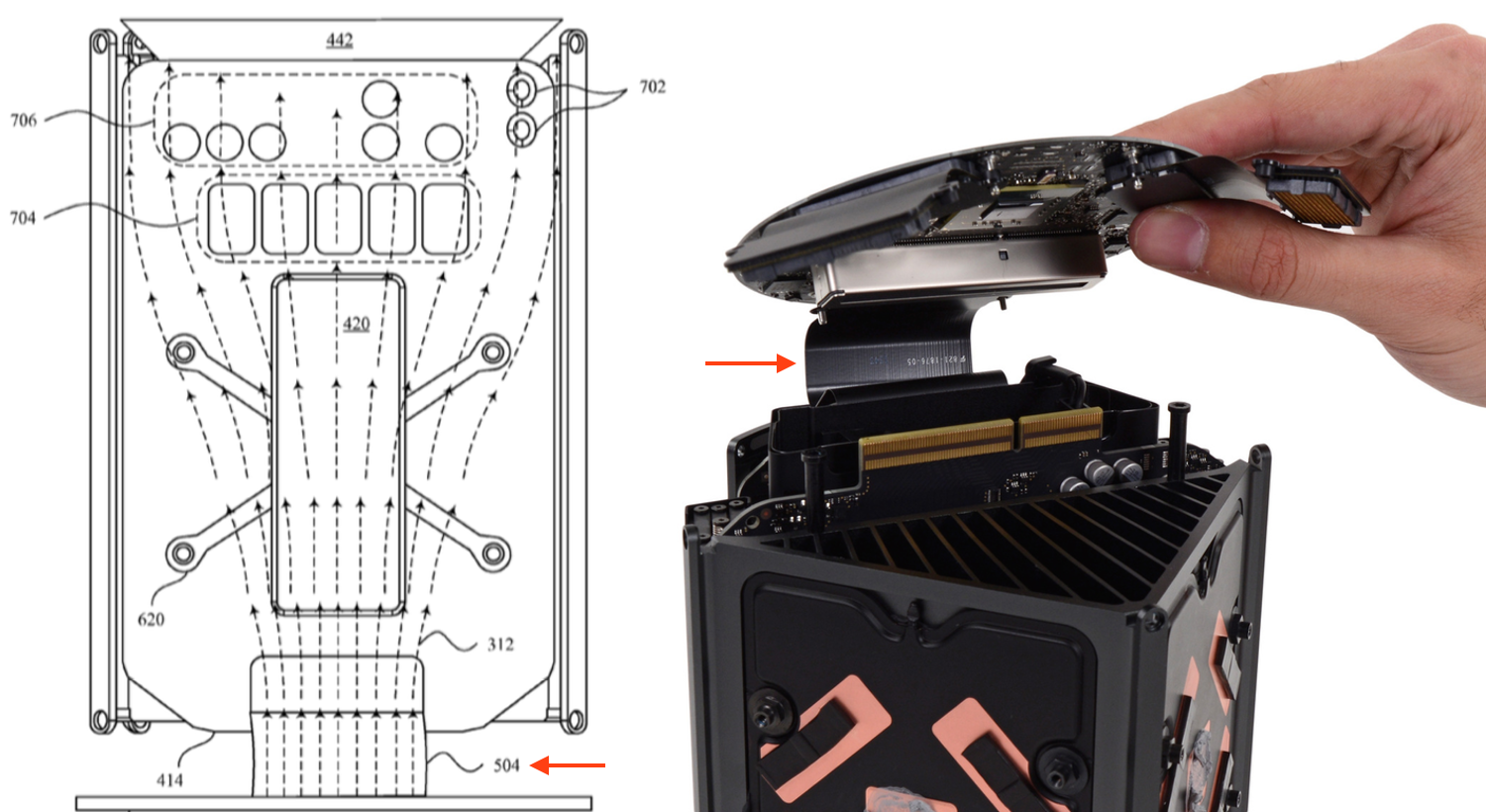 さらに、このリブによって吸気口(124)から内部へと送られた空気は、CPU, GPUボードとメイン ロジックボード(Main Logic Board :MLB (422))をつないでいる3つのフレックスケーブル(504)をスプリッターとして使用し分割され効率よくCPU, GPUボードを冷やすために使用されているそうです。