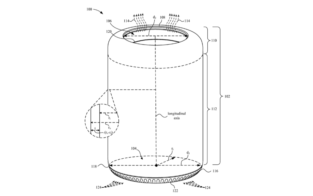 Mac Pro Late 2013の筐体は円柱状で、第1(124)、第2(114)口が開いており、第1口のサイズと形は伝熱媒体を冷却するために十分なエアフローを送れ、第2口は内部コンポーネントから渡された熱を排出する。(20140361672と20140362519)