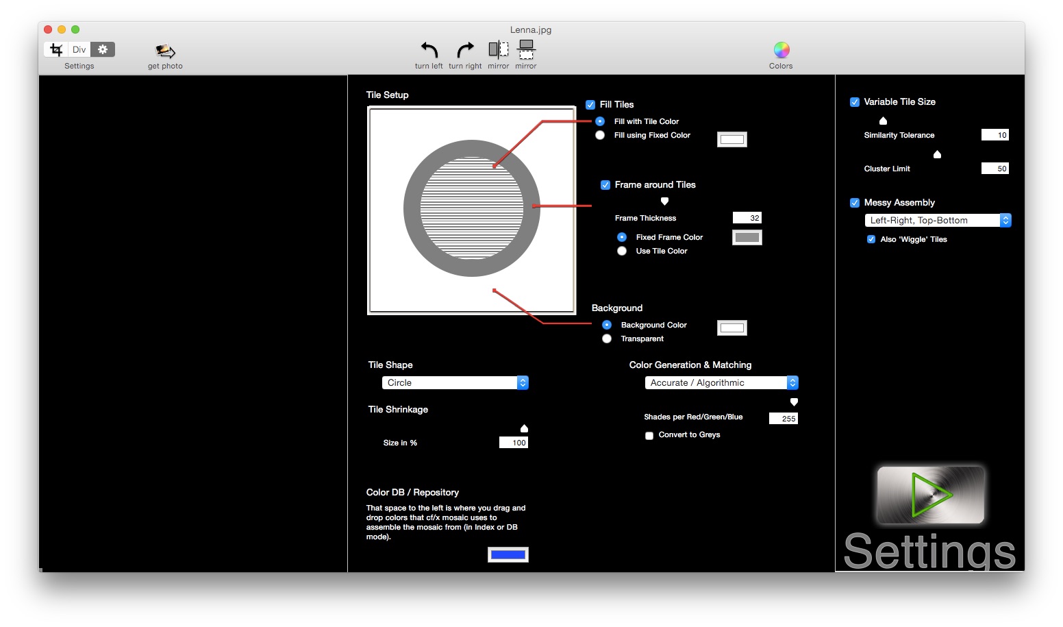 モザイク画に使用するタイルはSettingsから「Tile Shape」でタイルの形、「Fill Tiles」でタイルとタイルの間のカラーやスペースが設定可能で、「Variable Tile Size」と「Messy Assembly」で様々な大きさのタイルを使用したモザイク画を作成することも可能です。