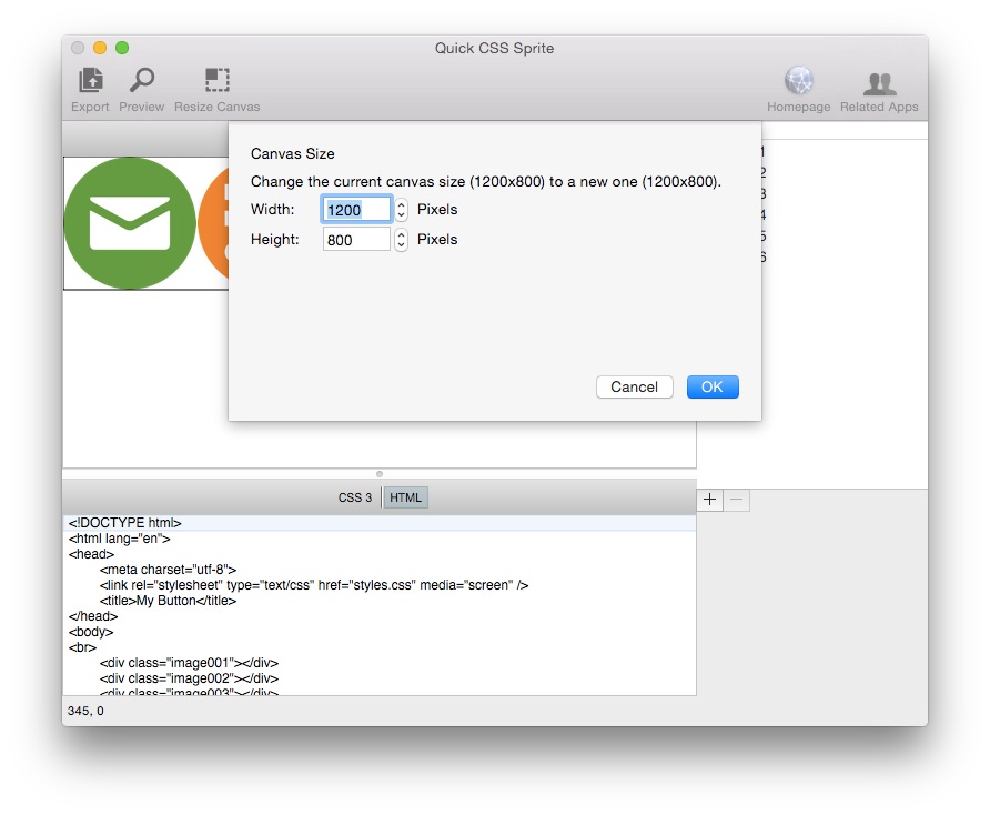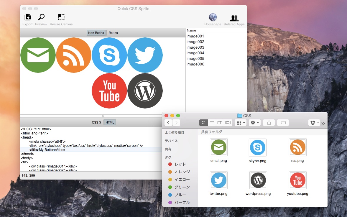 )もいくつかありますが、Quick CSS Spriteはオフラインでも使用でき画像はキャンバスサイズを指定して「Non Retina」と「Retina」を分けて作成可能で、プレビューも可能です。