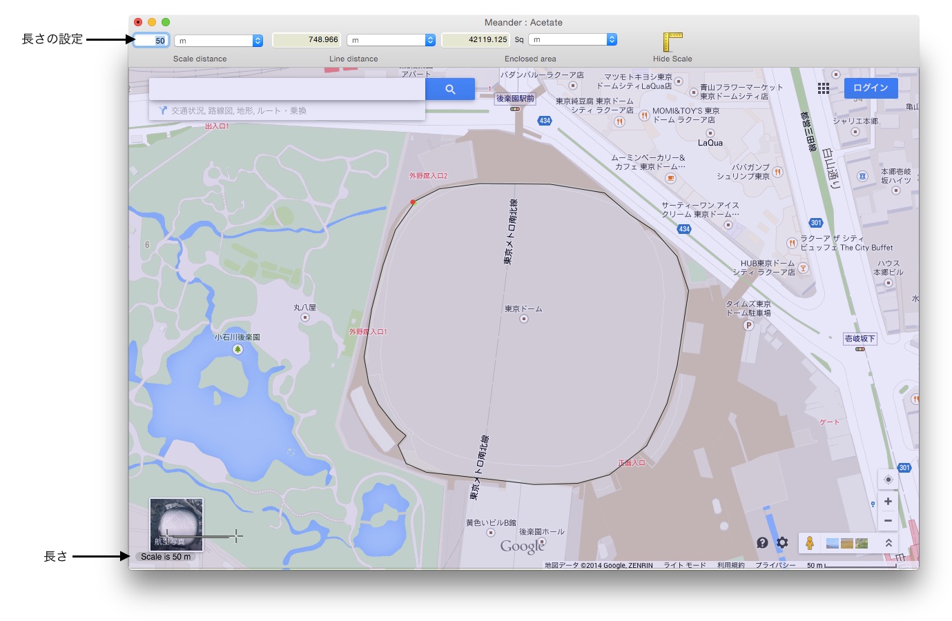 使い方はMeanderを起動し表示された透明なWindowの背面に図面や地図を配置しLineツールで測定したいエリアを囲うだけです。