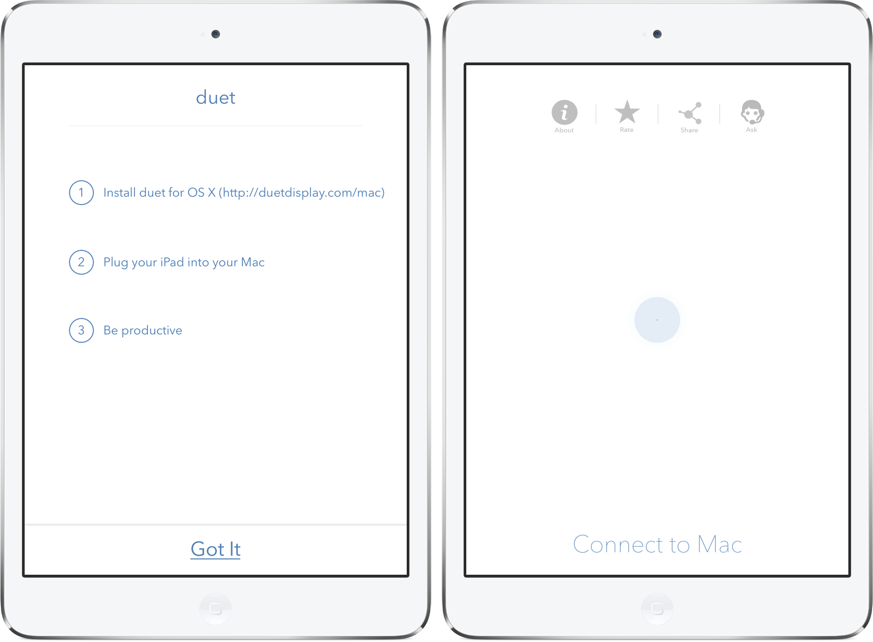 3.後はDuet Displayを起動して”Got It”をクリックし、”Connect To Mac”の表示が出たらMacにUSB接続するだけです。