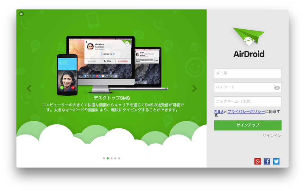 AirDroidはPC/MacからAndroid端末を管理するユーティリティアプリ(Web版)でしたが、v3.0のアップデートに伴い、通話、SMS、アプリ通知などをPC/MacとAndroid端末で共有できるようになっています。