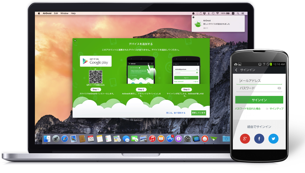 既にAirDroidを使用している方はアプリのアップデートだけですが、初めて使用する方は公式サイトからMac用アプリ、Android用アプリをGoogle Playからインストール。(注:全ての機能を使用するにはAndoridのroot権限が必要です)