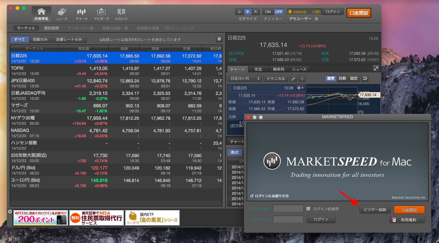 また、取引には楽天証券の口座開設、ユーザー登録が必要ですが、ログインウィンドウで「ビジター接続」を選択すればデモユーザーとして一部の機能を見ることが出来ます。