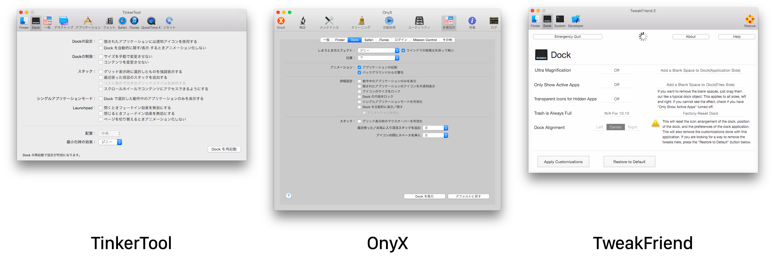 11月にリリースされたばかりなのでまだTinkerToolやOnyXで有効にできるオプション数に及びませんが、TinkerToolやOnyXでは有効にできないオプションもいくつか用意されているので興味のある方は関連リンクからどうぞ。(ダウンロードはMacUpdateから可能です)。