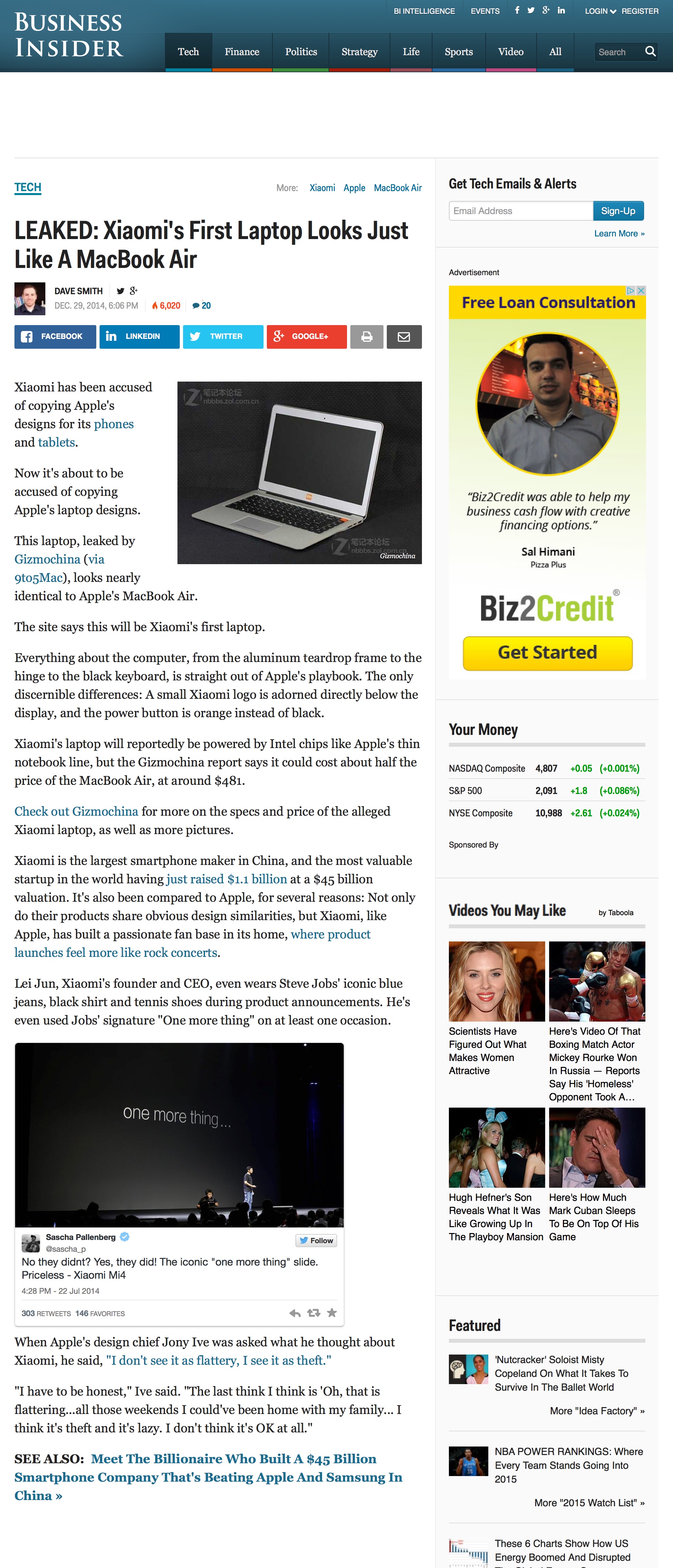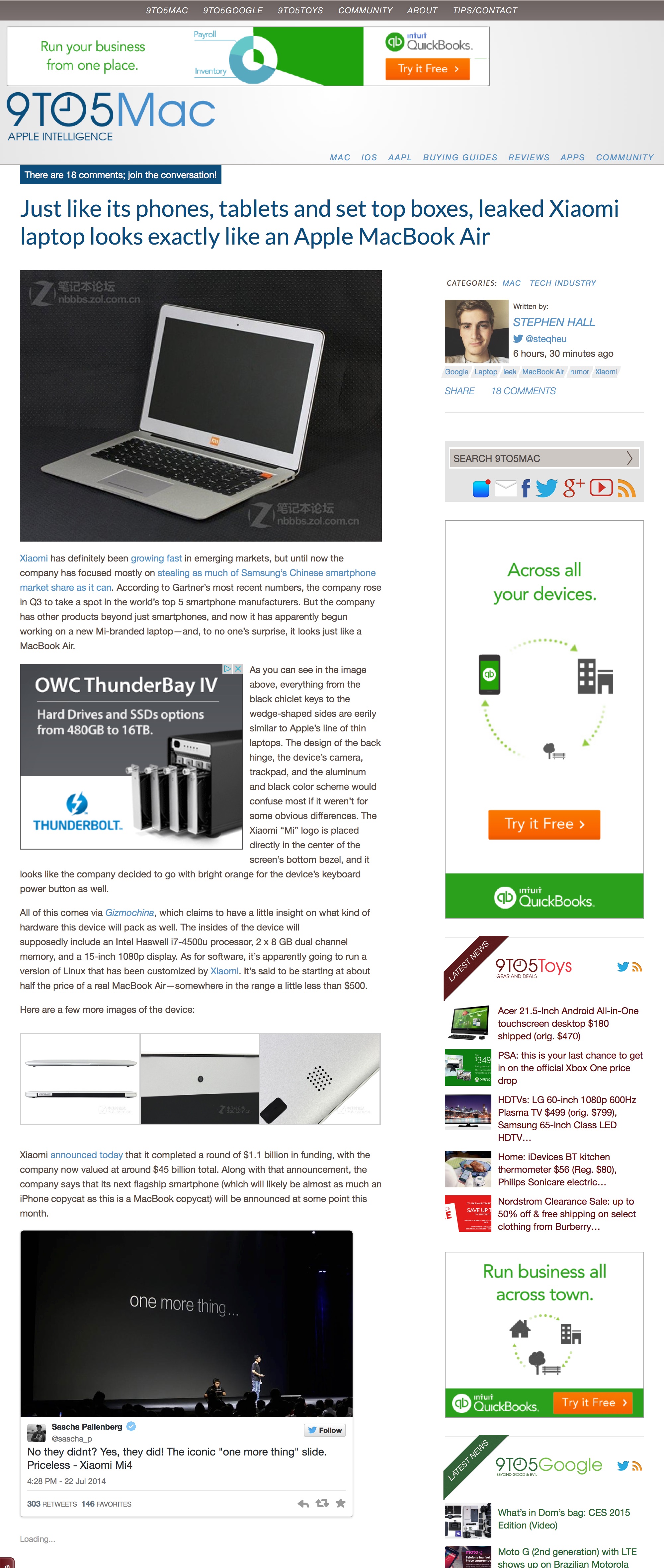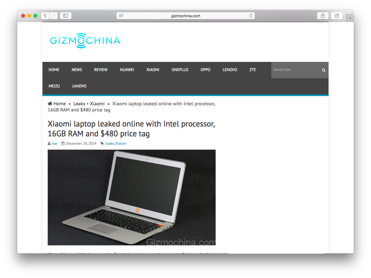 事の発端はGizmoChinaという中国のガジェットサイトに掲載された”Xiaomi laptop leaked online with Intel processor, 16GB RAM and $480 price tag“という記事で、「XiaomiがMacBook AirとそっくりのノートPCを開発中」という記事が掲載され、その後BusinessInsider(修正前)や9to5mac(修正前)などが引用。