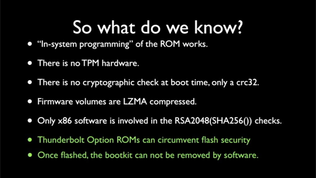 It is possible to use a Thunderbolt Option ROM to circumvent the cryptographic signature checks in Apple’s EFI firmware update routines. This allows an attacker with physical access to the machine to write untrusted code to the SPI flash ROM on the motherboard and creates a new class of firmware bootkits for the MacBook systems.