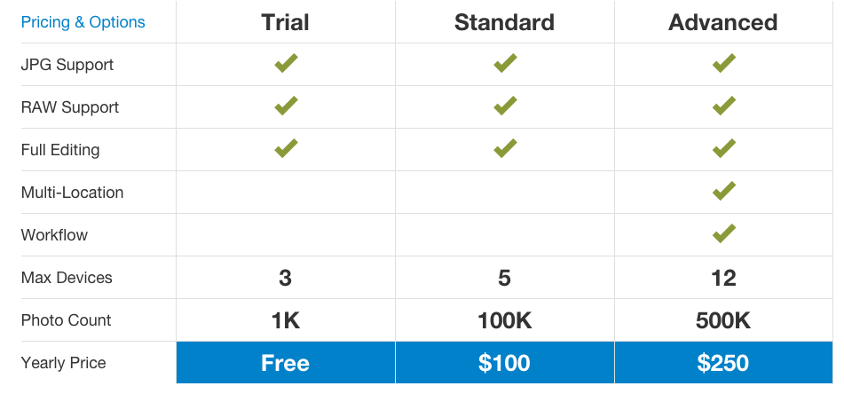 Mylioはサブスクリプション制で、Trialアカウントの場合は3デバイスでのアカウント使用や1000枚まで写真の同期が可能で、その他5デバイス&写真10万枚まで使用可能な100ドル/年のStandard、12デバイス&写真50万枚や作業同期が使用可能な250ドル/年のAdvancedプランが用意されています。
