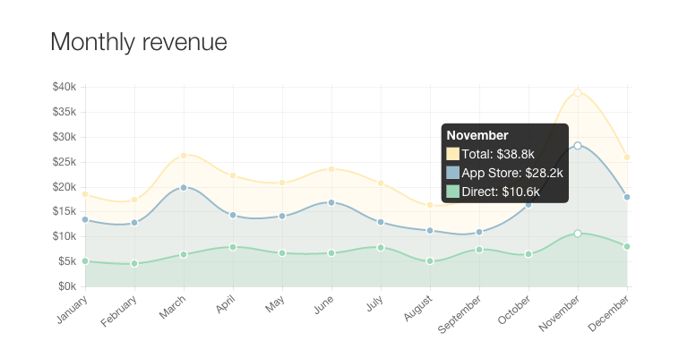 月別での売上は11月が最も多く38.8kドル、これはDash API Docs(iOS版)を9.99ドルでリリースしたからだそうで、次いでDash 2.0(Mac版)