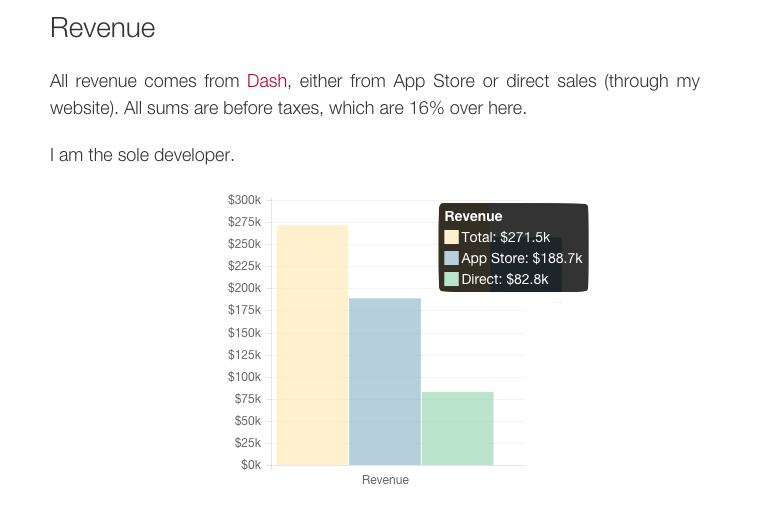 Dashの去年1年間の売上はApp Storeでの売上が188.7kドル、自社サイトでの売上が82.8kドルで税引前の合計は271.5kドル(約3270万円)となったそうです。