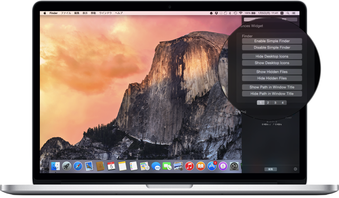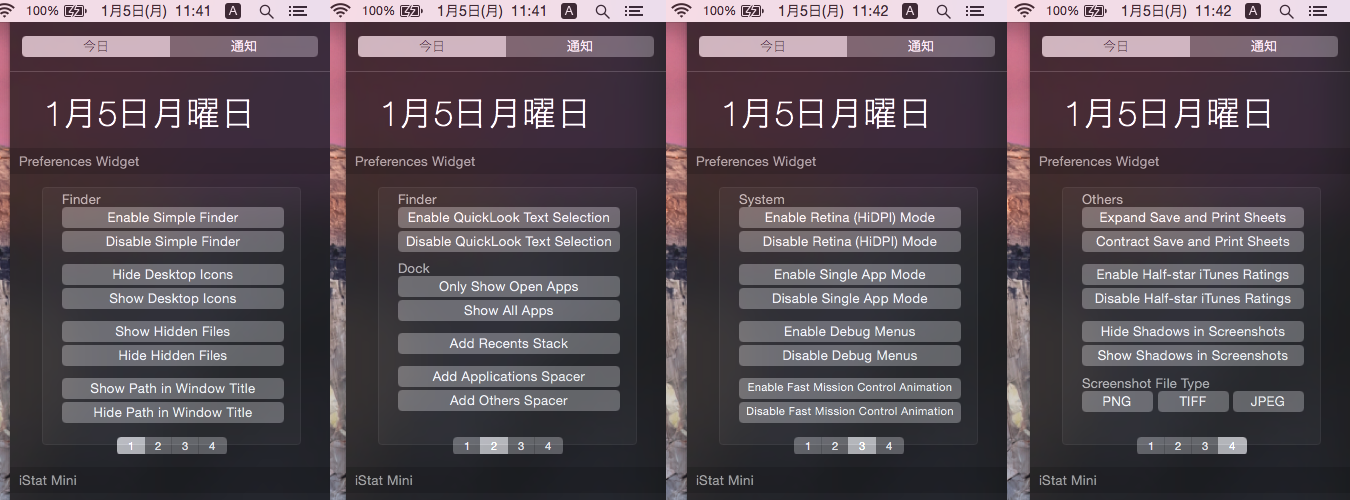 Macの「隠しファイル/フォルダの表示」や「起動しているアプリのみDockに表示する」などの隠し機能をOS X Yosemiteの通知センターから有効にできるWidgets「Yosemite Preferences」がリリースされています。詳細は以下から。