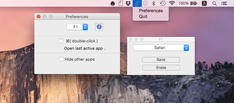 後はメニューバーからMySwitchをの設定ウィンドウを開いて、ファンクションキーに割り当てたいアプリを設定していくだけですが、不具合かどうか分かりませんが、使用できるアプリには条件があるようです(Safari、App Store、Xcode、iTunesなどは使用できます)。