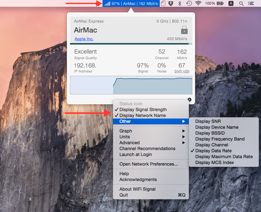 機能としては現在使用中のWiFiの強度やIPアドレス、周波数帯、ルーター名、ノイズ、データレート、グラフなどの表示の他、メニューバーに表示させておけるオプションも有ります。