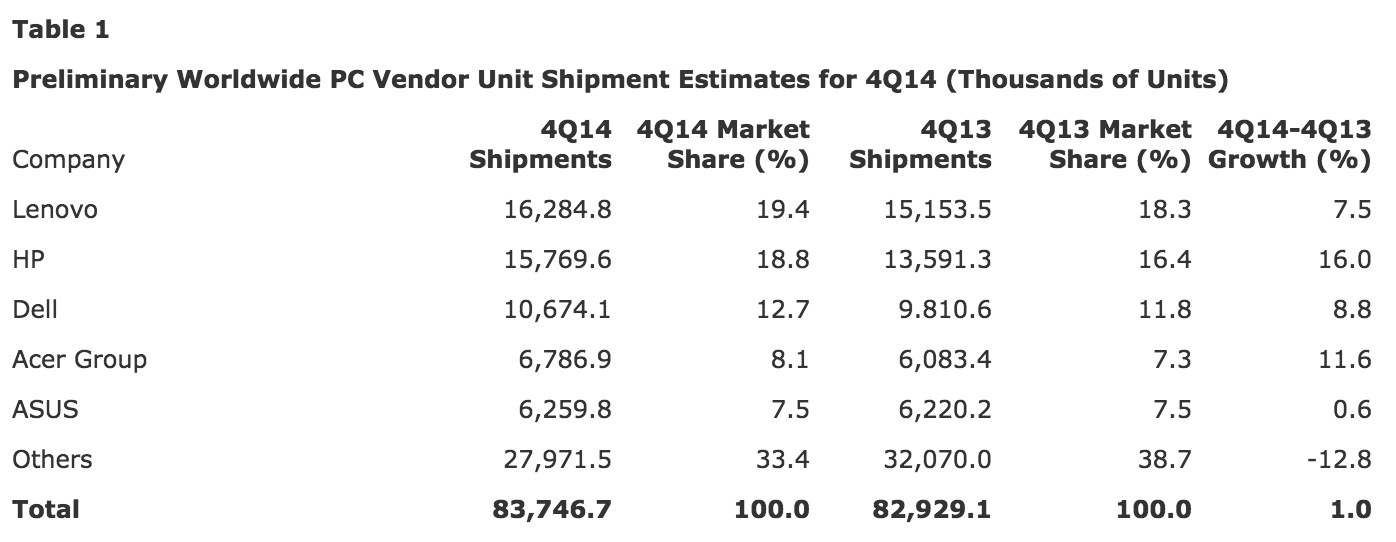 米Gartnerも同様にPC市場シェアのデータ”Gartner Says Worldwide PC Shipments Grew 1 Percent in Fourth Quarter of 2014“を公開しており、こちらのデータでは非Windowsタブレット(iPad)が除外されているためAppleはTop5から脱落し、代わりにASUSが5位となっているそうです。