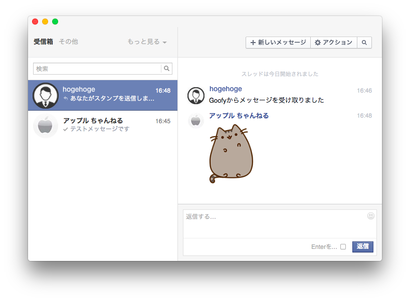 基本的にFacebookのメッセージがそのまま使用されているので、Facebookのメッセージサービスと同様の機能が使用可能です。