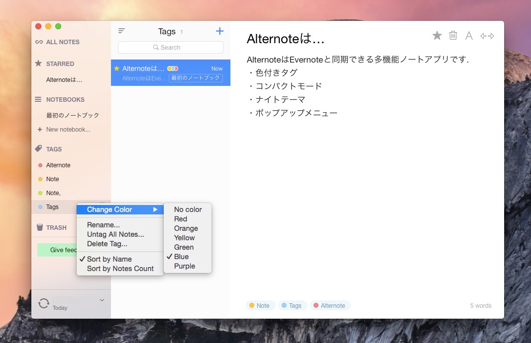AlternoteではEvernoteのタグ機能にカラー表示が可能になっており、リアルタイム文字カウントも実装されています(まだ英語のみ)。
