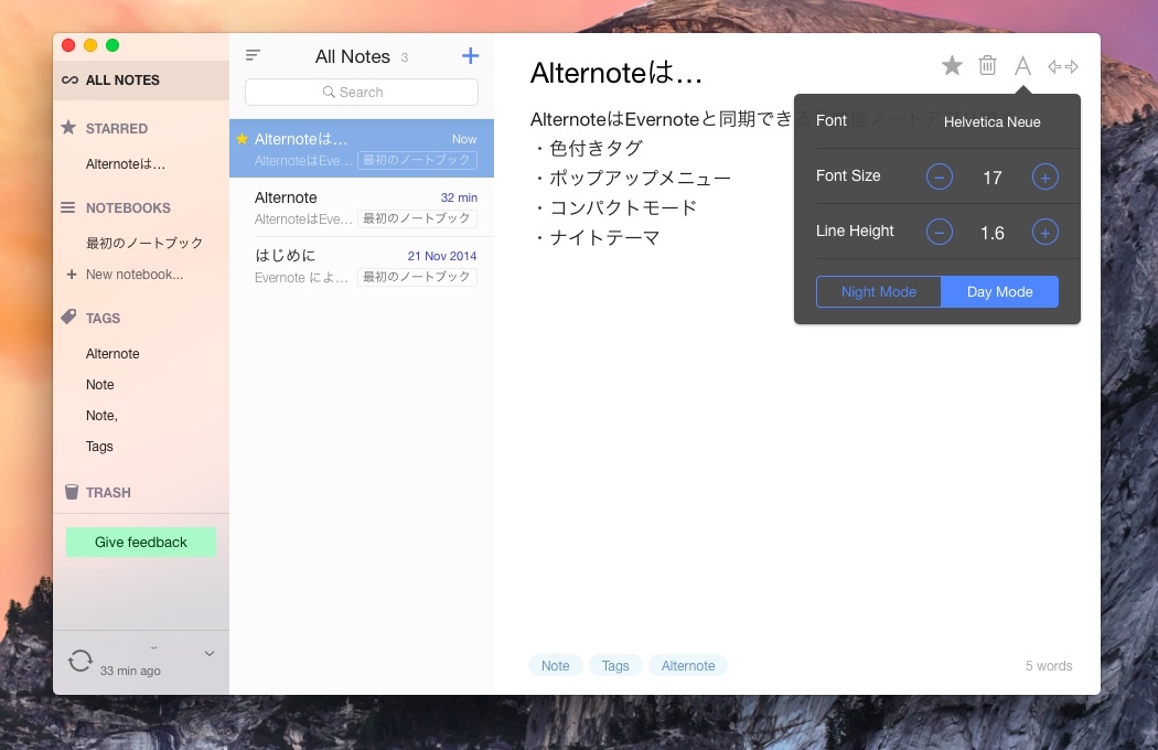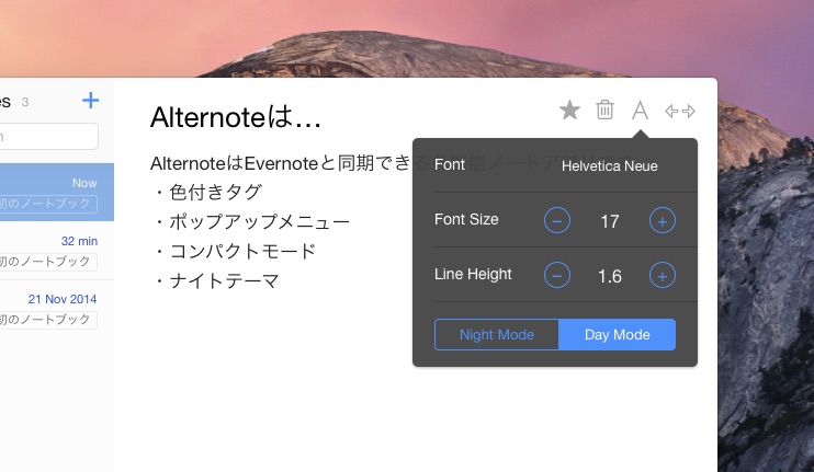 AlternoteはYosemiteのDark Modeに合わせたカラーテーマNight Modeとビルトインフォントを備えており、左上の[Font and Color Scheme Setting]から変更可能です。