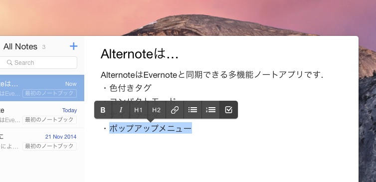 Alternoteはポップアップメニューに対応しており、文字をハイライトにすることでフォント・リンク・ToDoリストポップアップが表示されます。