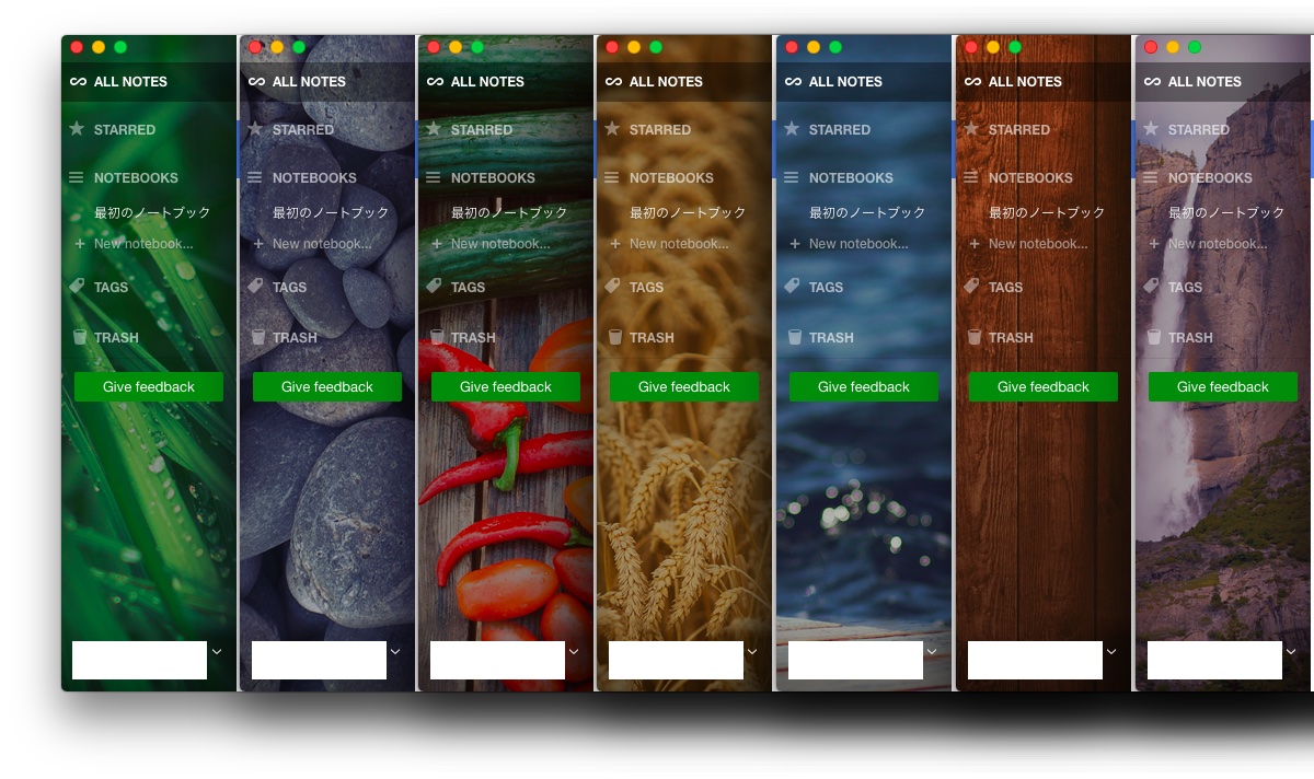 Alternoteは3つのカラーと6つのイメージ背景が用意されており、左隅アカウントメニューの[Chage Background]から変更することが出来ます。