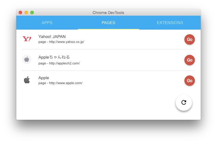 3.Chrome DevTools.appを起動すると現在Google Chromeのタブにあるコンテンツが表示されるので”Go”をクリックすると、そのコンテンツがデベロッパーツールで表示されます。