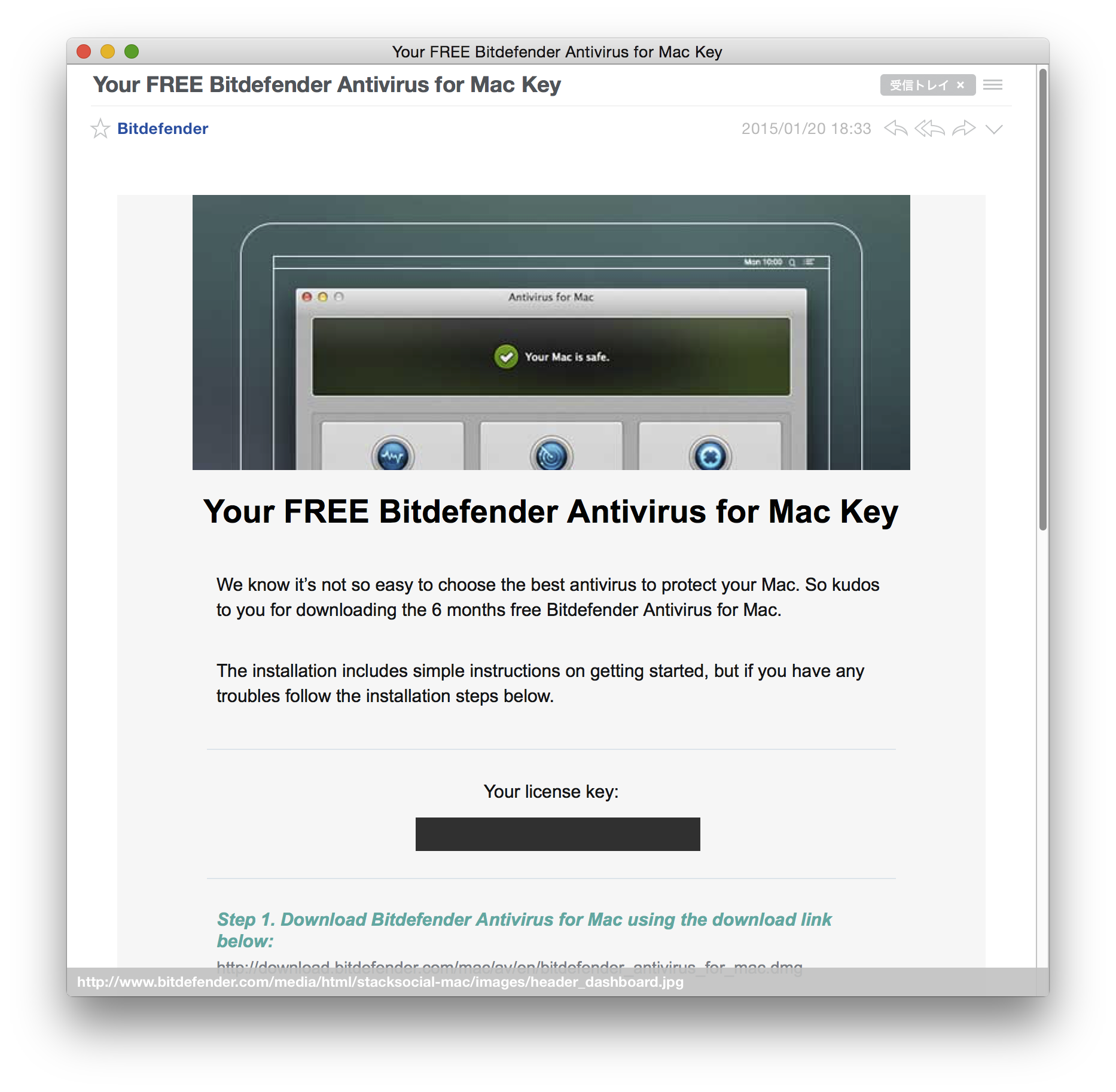 米Bitdefenderアカウントが告知しているため、日本からHug a Macキャンペーンに参加してもMacBook Air 13インチがもらえるは分かりませんが、6ヶ月ライセンスはメールアドレスを登録、その後ライセンスキーが添付されたメールが送られてくるので、