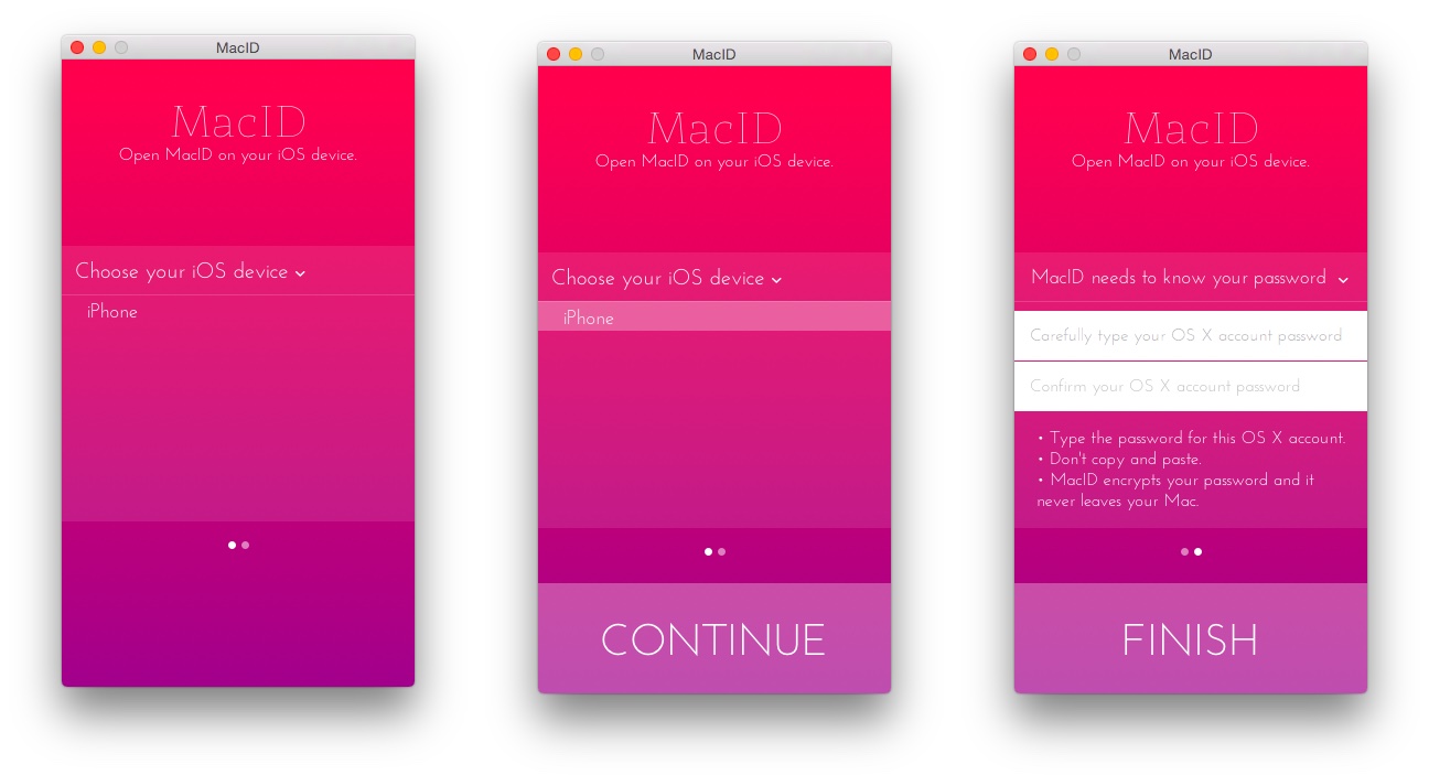 2.Mac側のアプリを起動するとBluetooth 4.0 LEが有効な周辺のiOSデバイスを自動的に検索&表示するので、ペアリングしたいデバイスを選択し[Continue] > [Macのパスワードを登録] > [Finish]と進みます。