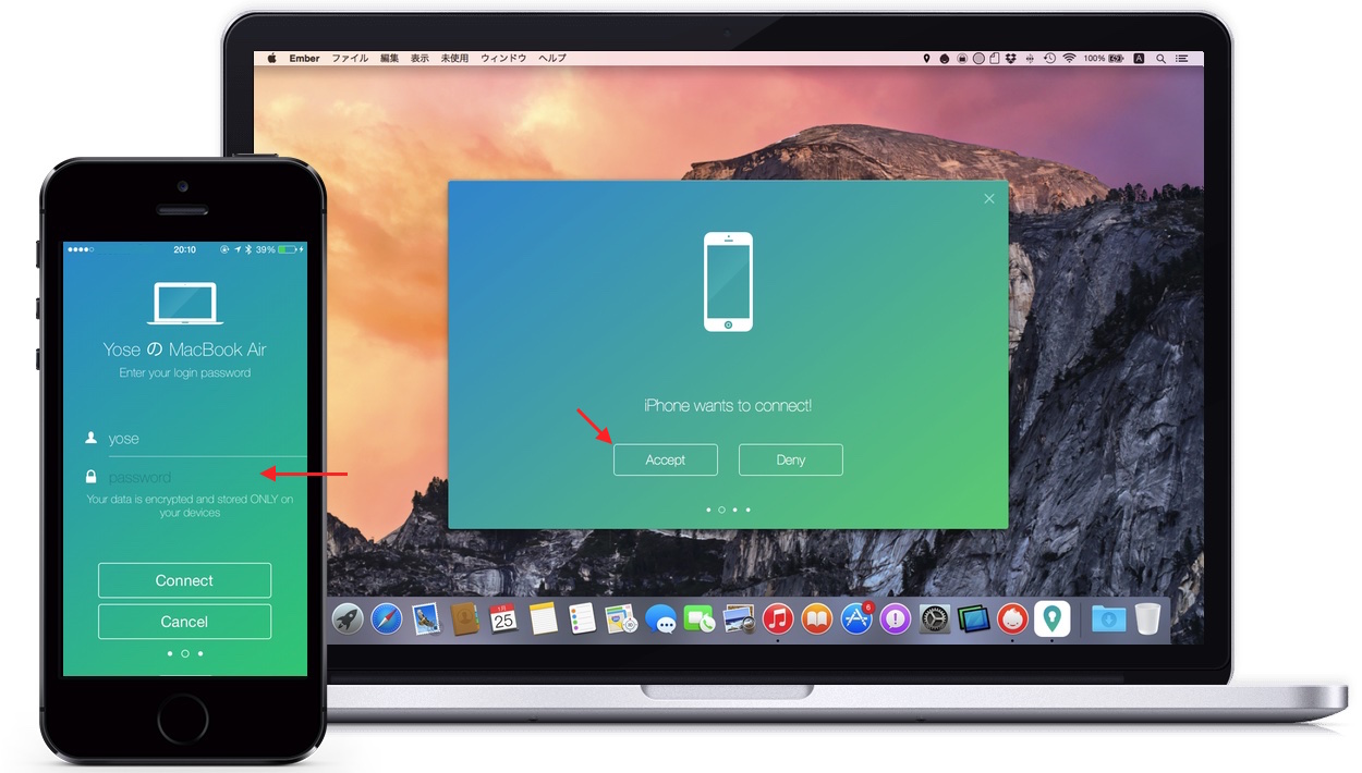 2.MacとiOSアプリを起動して、Macに”iPhone wants to connect!”と表示されたらAcceptを選択し、iOSアプリにMacのログインパスワードを入力、これでMacとiOSデバイスとの紐付けが完了です。