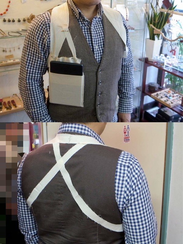 ポイントは脇下ではなく胸前にぶら下げるので、力のかかる後襟部分を作った事と