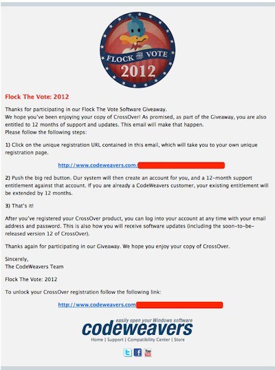 ・ハローウィンセールでダウンロードされた方は”Flock the Vote 2012″っというSubjectのメールが2012年11月1日〜16日の間に来ていると思うので、URLをクリック。