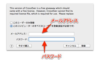 ・ CrossOverを起動して、上でコピーしたメールアドレスとパスワードを入力。
