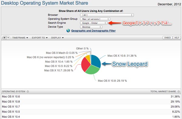 ちなみにNetMarketShareの統計ですが、統計を取るサーチエンジン(GoogleやYahoo!)によっては未だにOS X 10.6 Snow Leopardがトップだったりするので参考程度にどうぞ。