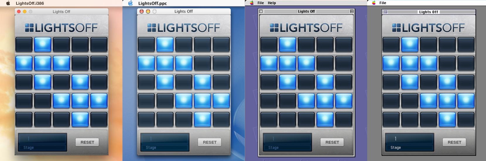 さらに、Steveさんはゲームアプリ”Lights Off”をSystem 7 ~ OS X Yosemiteで動作させることに成功しており(Macintosh ClassicではH/W的に失敗しているようですが)、