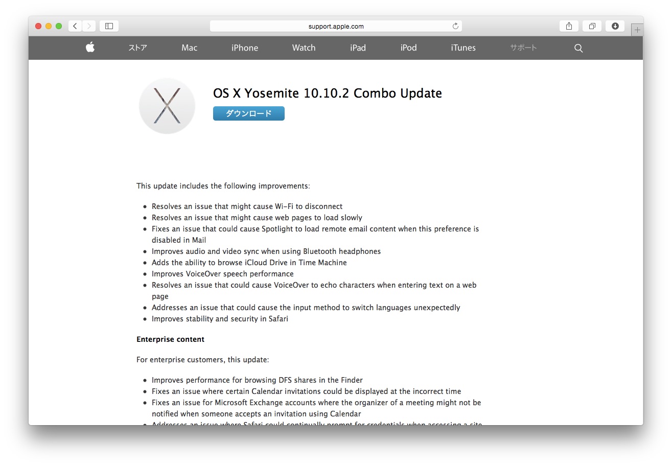 Appleが「OS X Yosemite 10.10.2 Combo Update」の提供を開始しています。詳細は以下から。