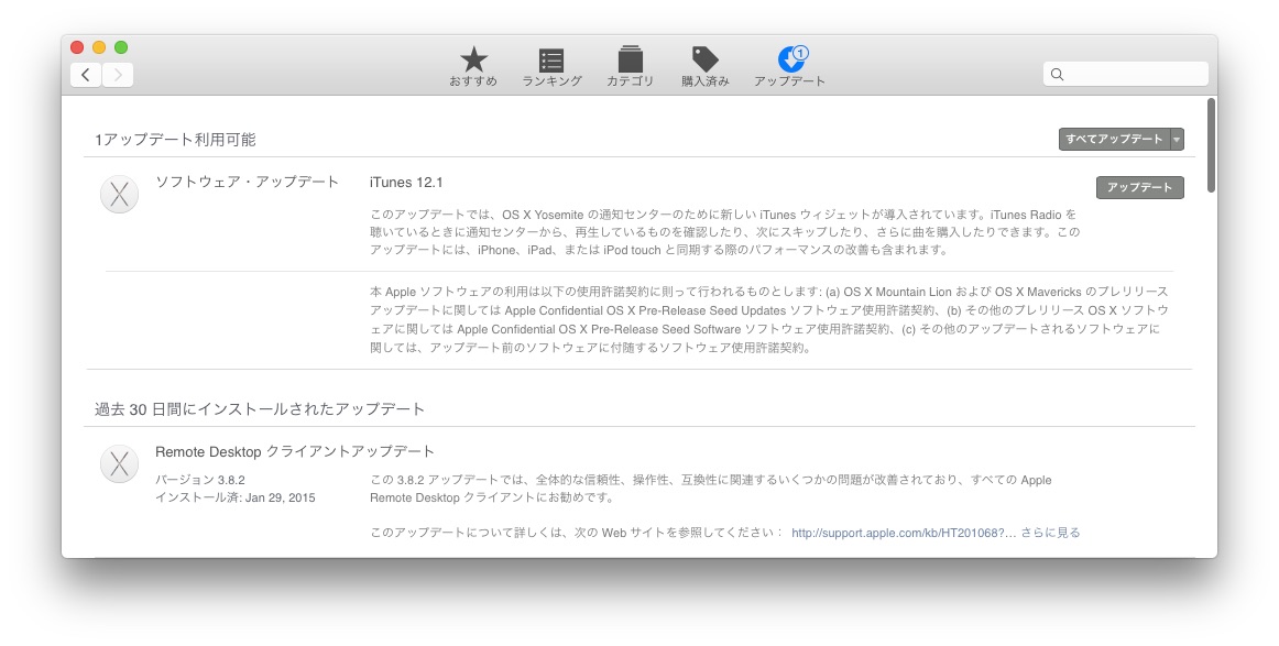 このアップデートでは、OS X Yosemiteの通知センターのために新しいiTunes ウィジェットが導入されています。iTunes Radioを聴いている時に通知センターから、再生しているものを確認しいたり、次にスキップしたり、さらに曲を購入したり出来ます。このアップデートには、iPhone、iPad、またはiPod touchとの同期するパフォーマンスも改善されています。